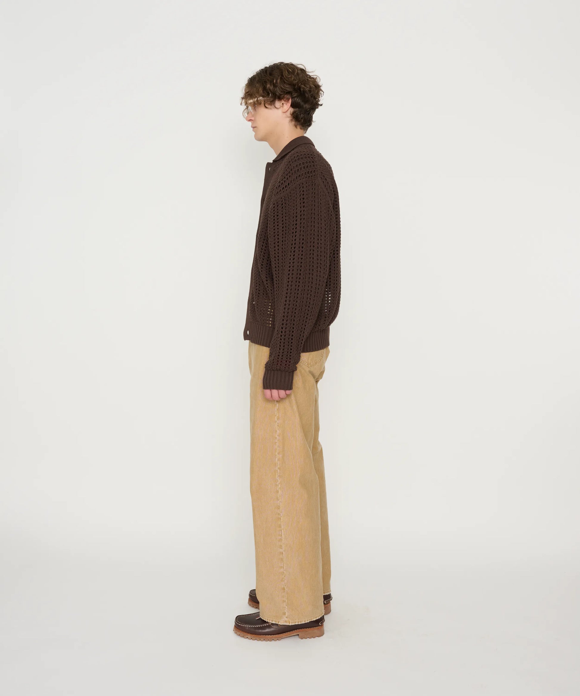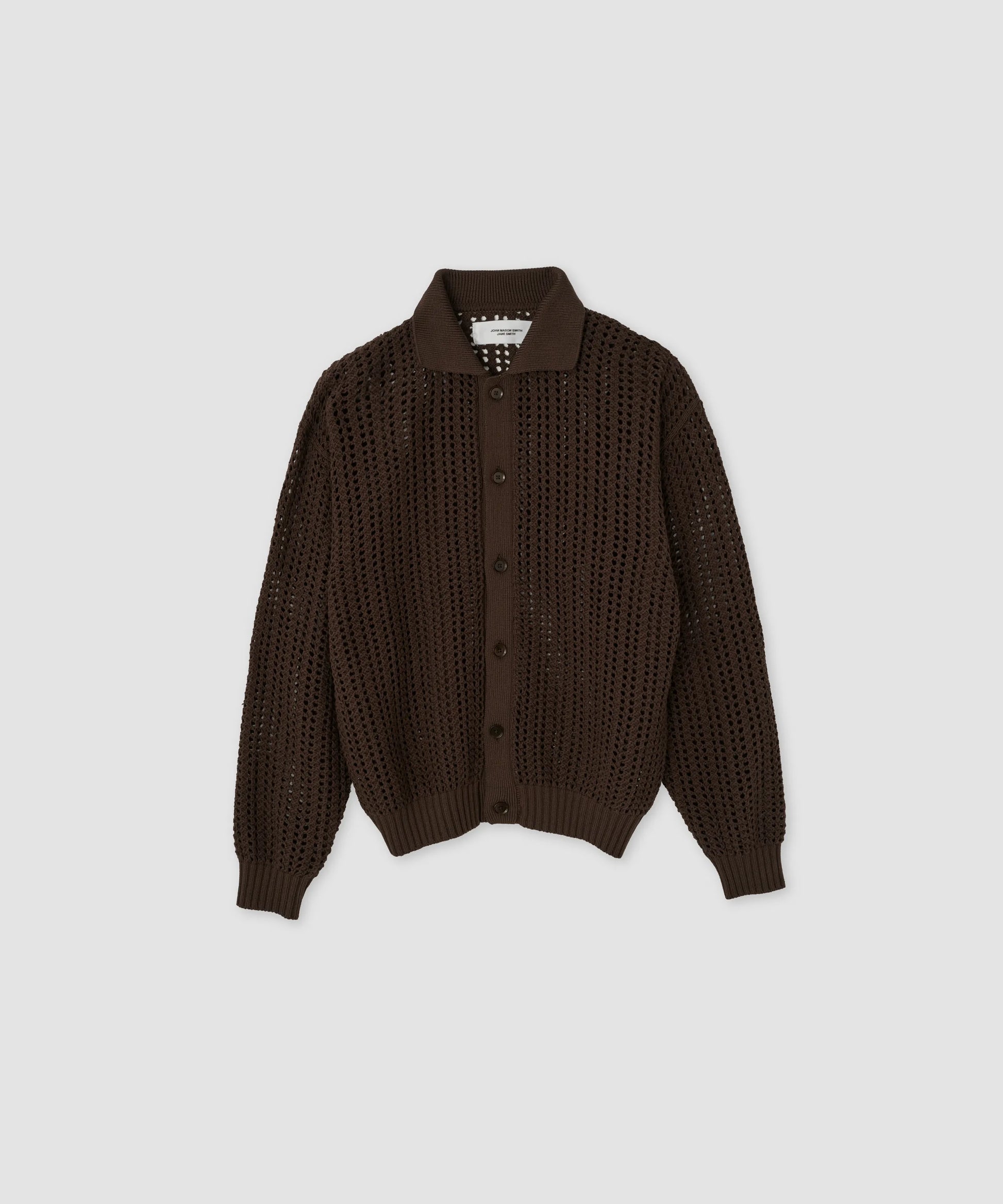 襟付きのカーディガンで身頃編み地は軽さとボリュームのある綿とポリエステルのリリヤーン糸で 編み地は機械編み 7G の変形メッシュ編みで糸の特性を生かした立体感のあるメッシュ編みになります。