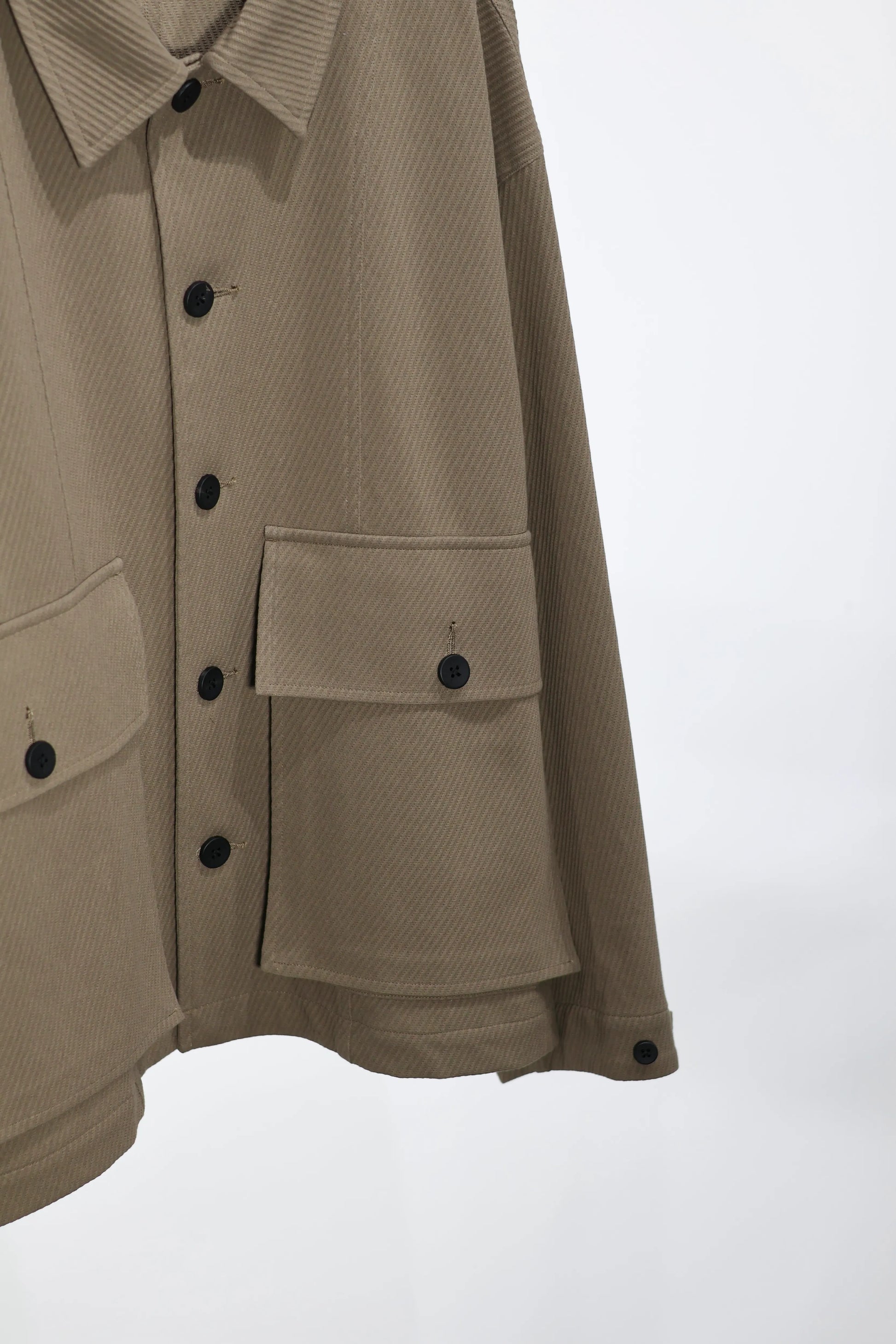 丸みのあるボックスシルエットを採用、腰の大きなポケットが特徴です。アームホール、身幅まで全てのパーツを計算し、パターンを引くことで、生地のポテンシャルを最大限に生かしております。身幅をしっかり取った1枚袖のブルゾンです。