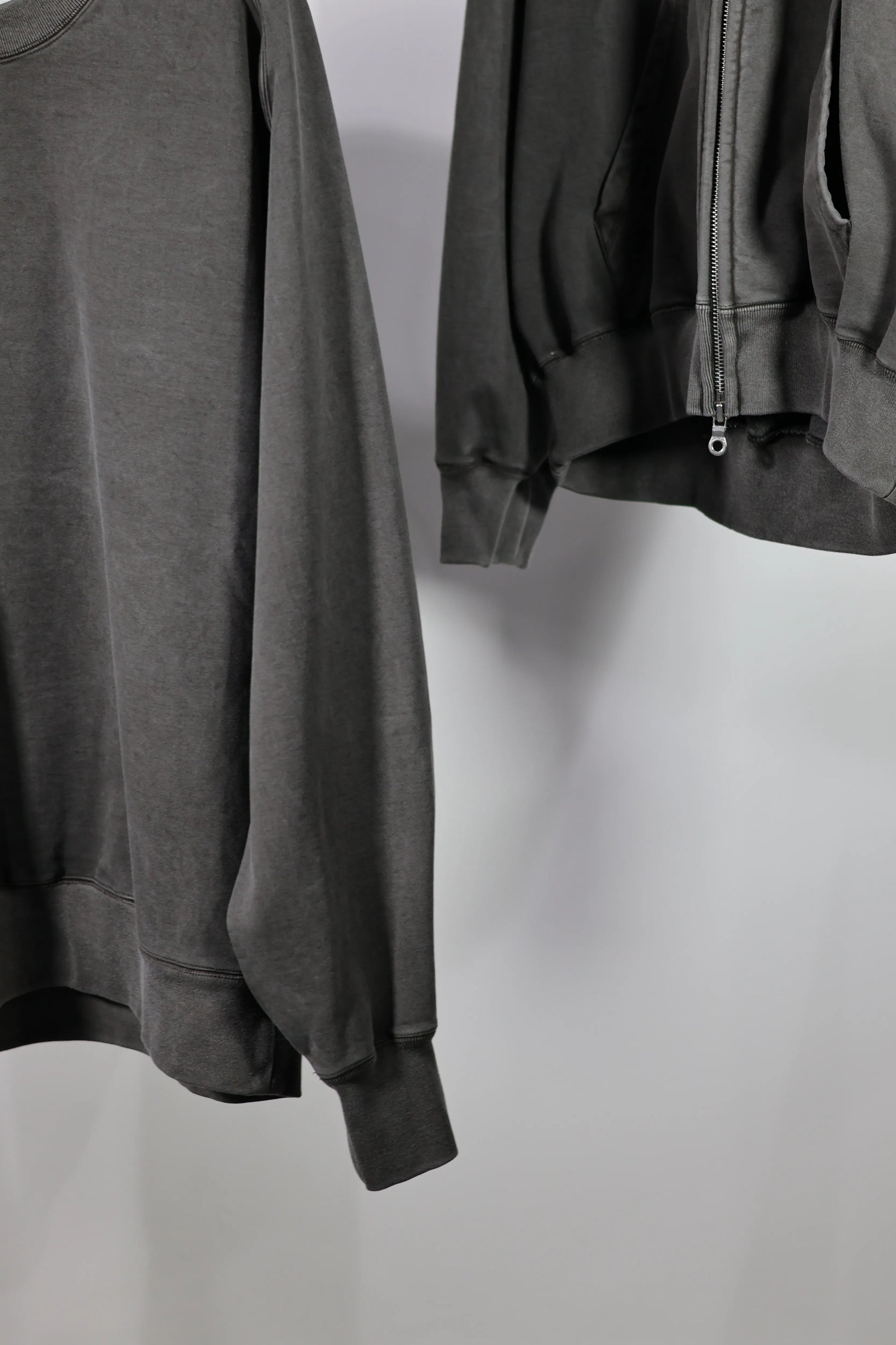 リブ周りは全てブラウジング縫製により、たるみのあるデザインに。 光沢感のある生地と相反する、リラックスなディティールを付けております。製品工程でタンブラー乾燥をすることで洗濯後の縮みなどがより無いように仕上げております。