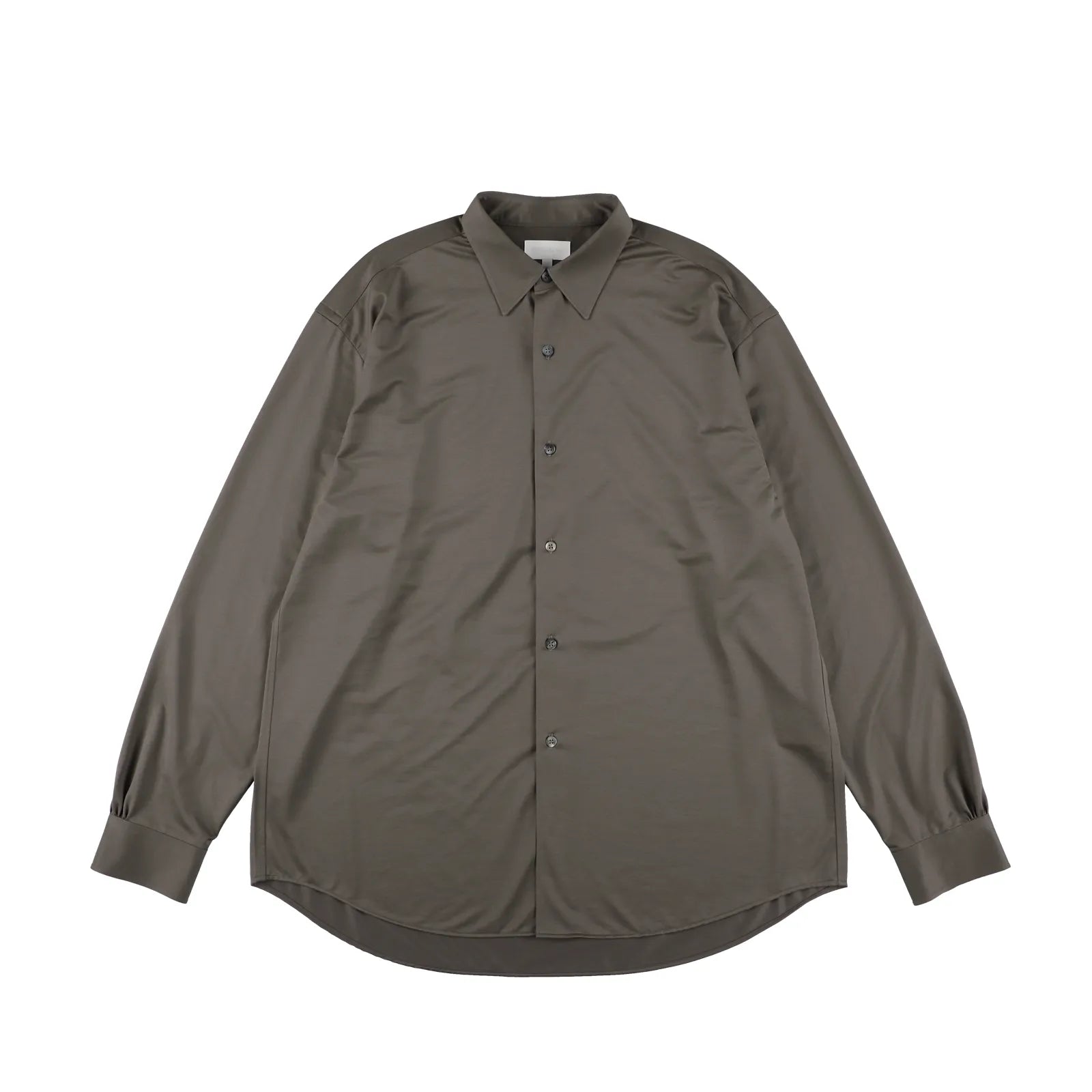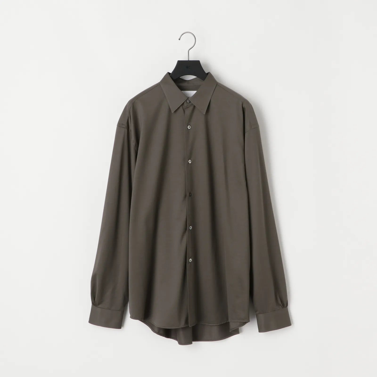 “atmosphere” 空気を纏うという名前の通り、 ゆったりとしたシルエット、素材の落ち感がわかりやすい定番シルエットのシャツです。46G という、スーパーハイゲージで、タイプライターという織物の高密度平織組織を実現。 ストレッチ性が高く一度着ると止められない着心地、そして、着用時のしわなどの形態変化も少なく、イージーケア性も高い。 ハリ感、光沢感、イージーケアを持ち併せた我々にしかできないニュースタンダードシャツ地。