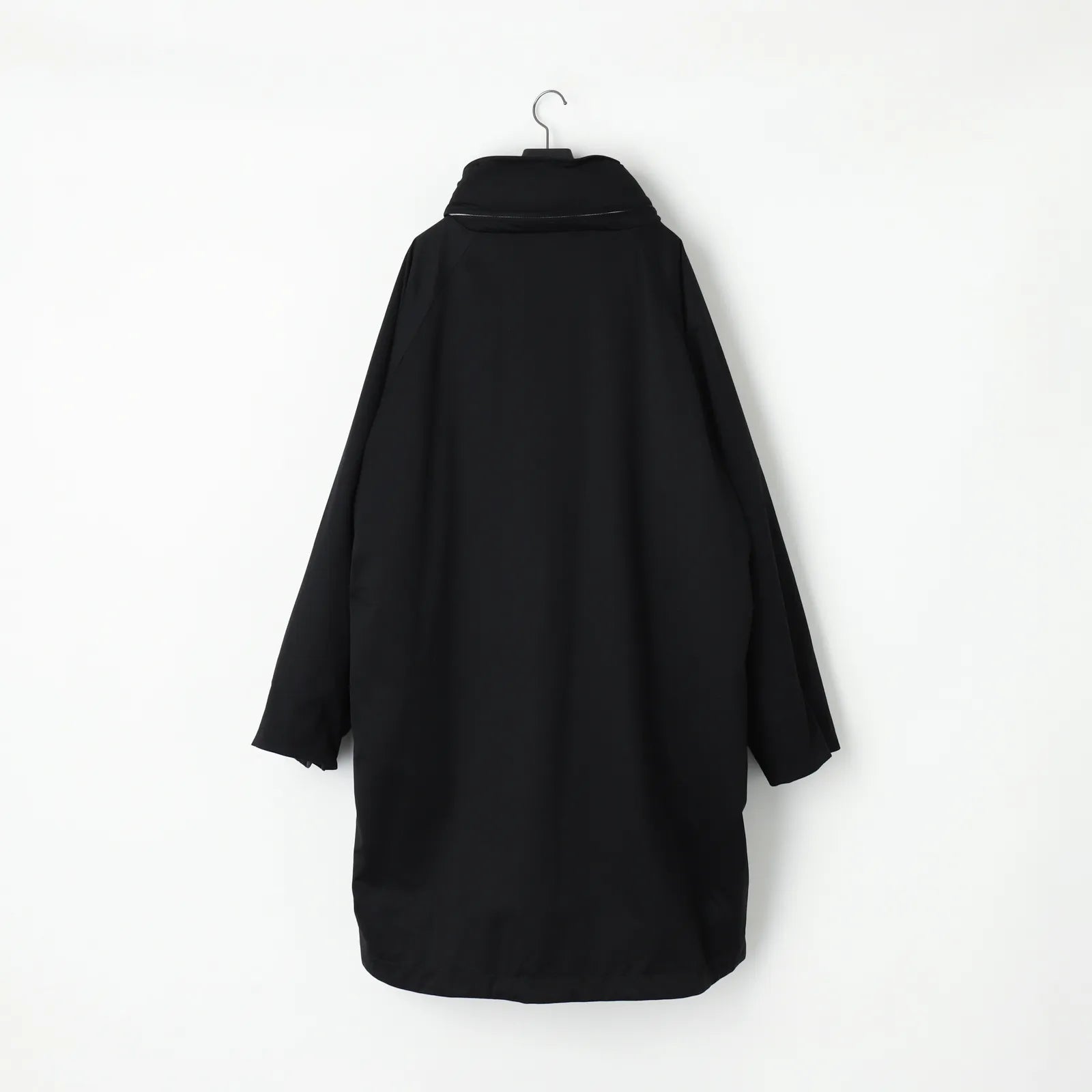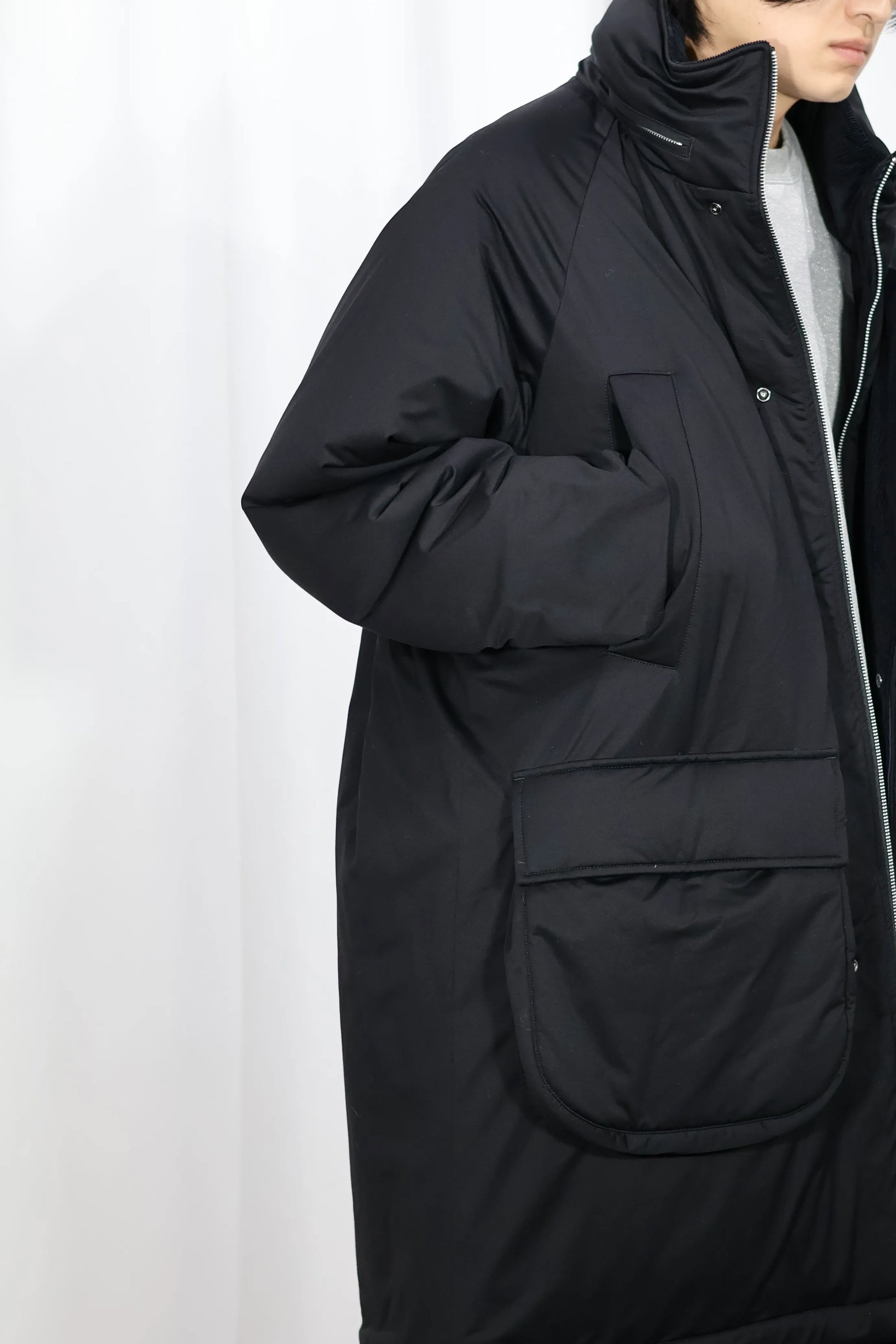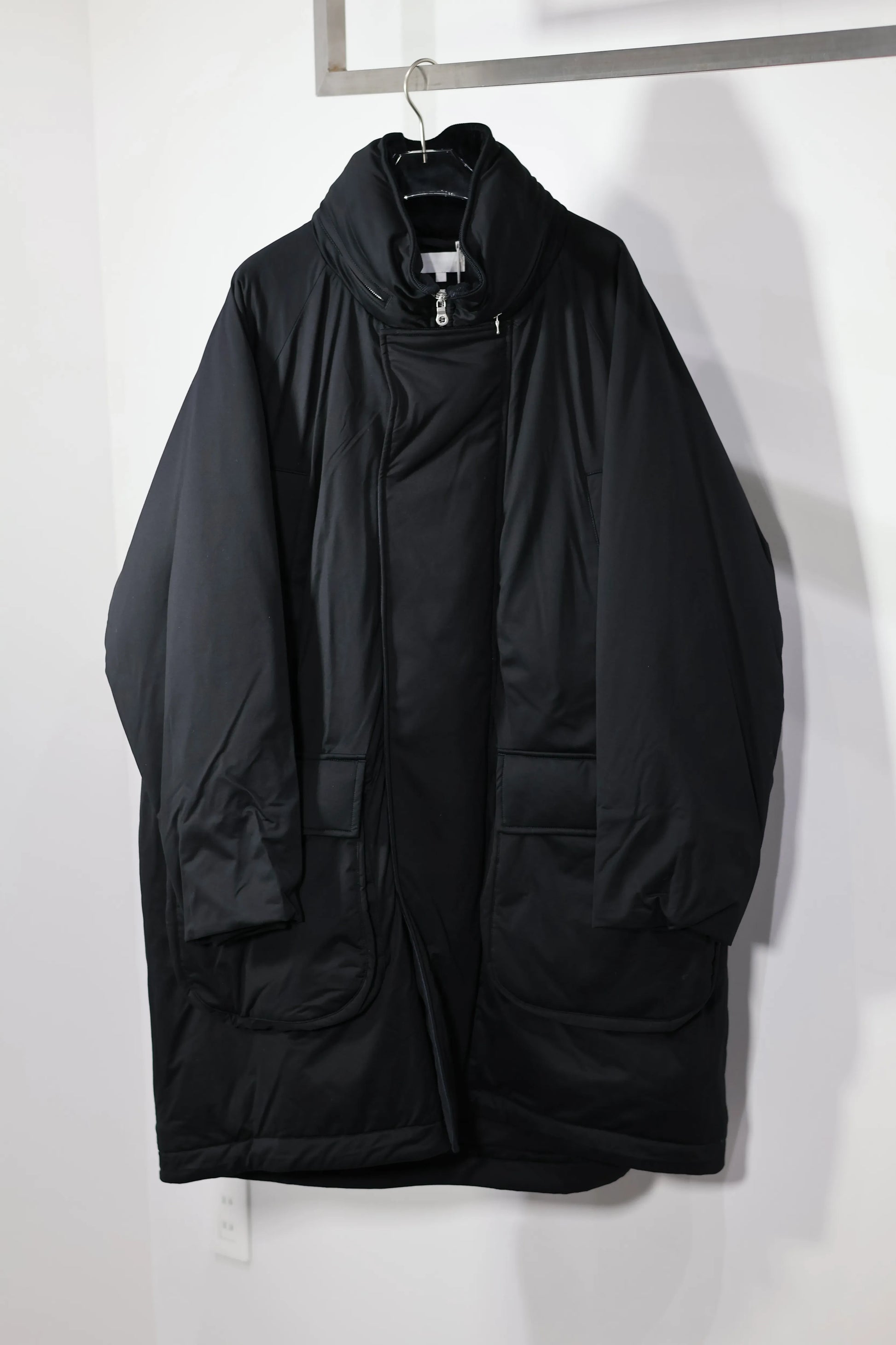 その素材を両面に仕様したアウター。中綿は、軽量発熱調整機能があり、程よい厚さの中綿を入れて着用しやすく仕上げております。素材の落ち感を生かしながら作成しているので、体に沿う丸みと着心地の軽さが特徴です。まるで布団を羽織っているかのような温かさがあるアウターです。