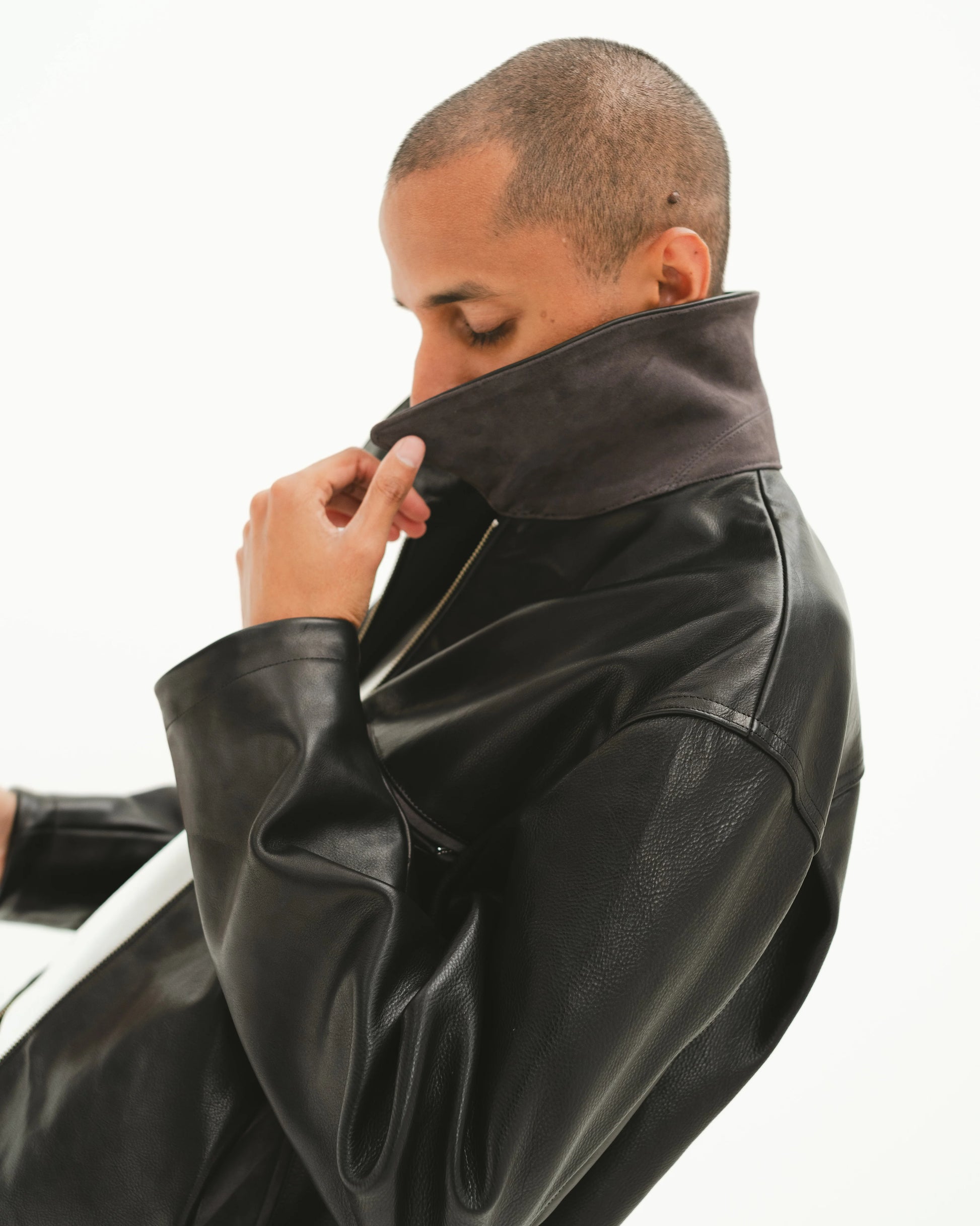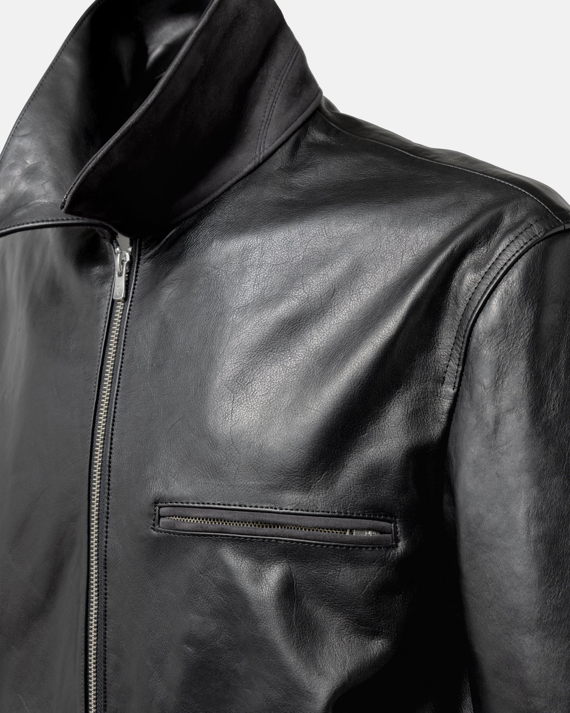 ワークウェアをベースにしながら、パーツを極限まで削ぎ落とし、ミニマルかつ洗練された佇まいに再構築。重厚感のあるレザーと滑らかなスウェードの質感が調和し、日常着としてもラグジュアリーな存在感を放つ一着です。